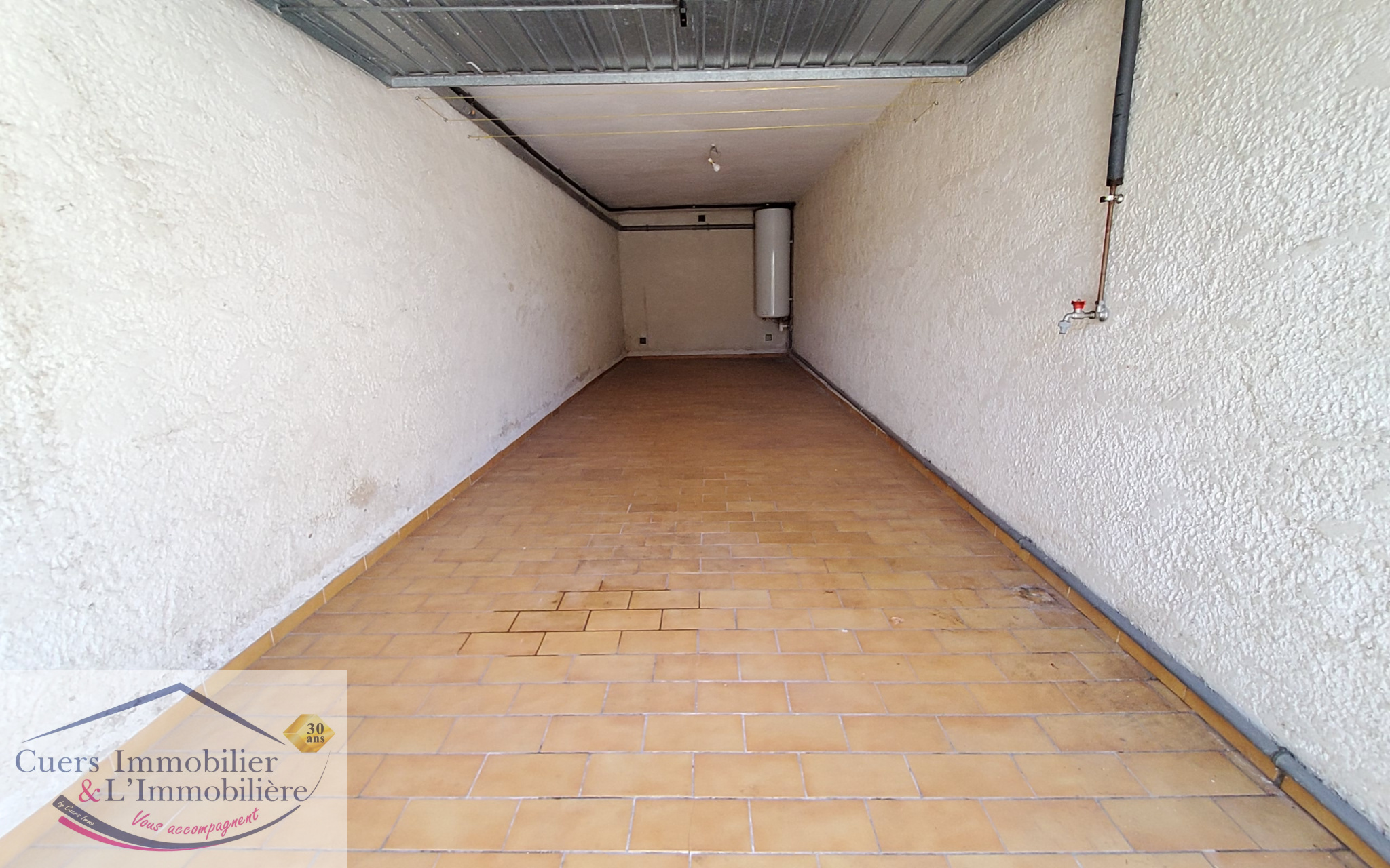 Présence d'une petite terrasse d'environ 6m2. Grand garage carrelé de 21m2 avec eau et electricité.