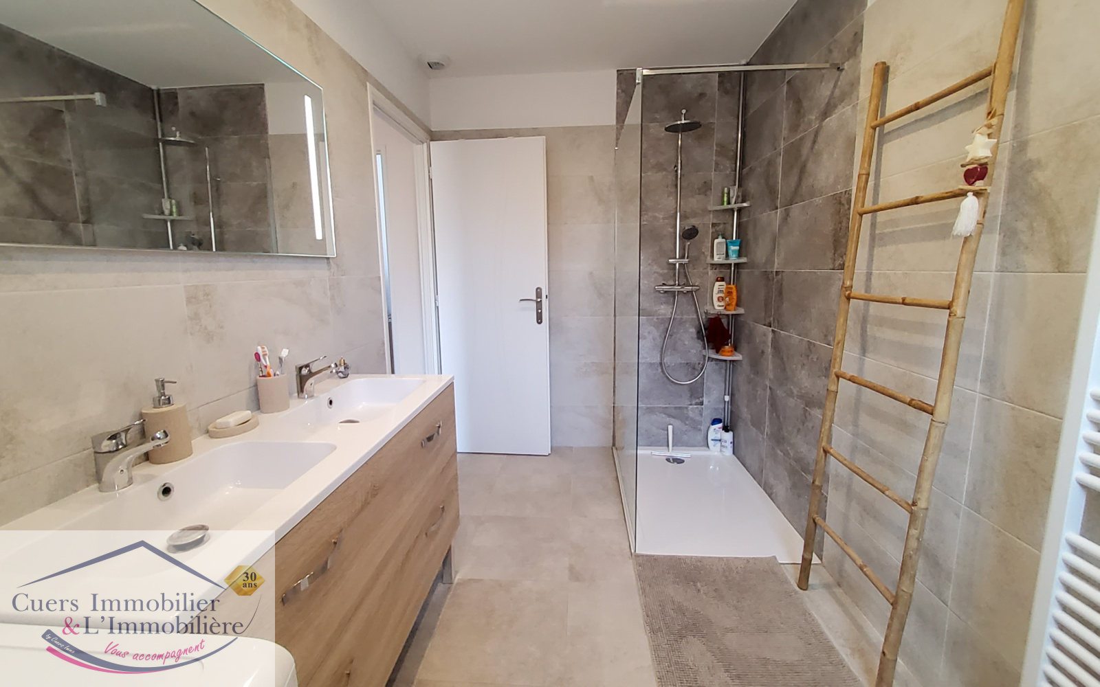 De nombreuses prestations, climatisation réversible centralisée, menuiseries PVC double vitrage anthracite, volets roulants électriques avec domotique, éclairage spot avec variateur, adoucisseur..