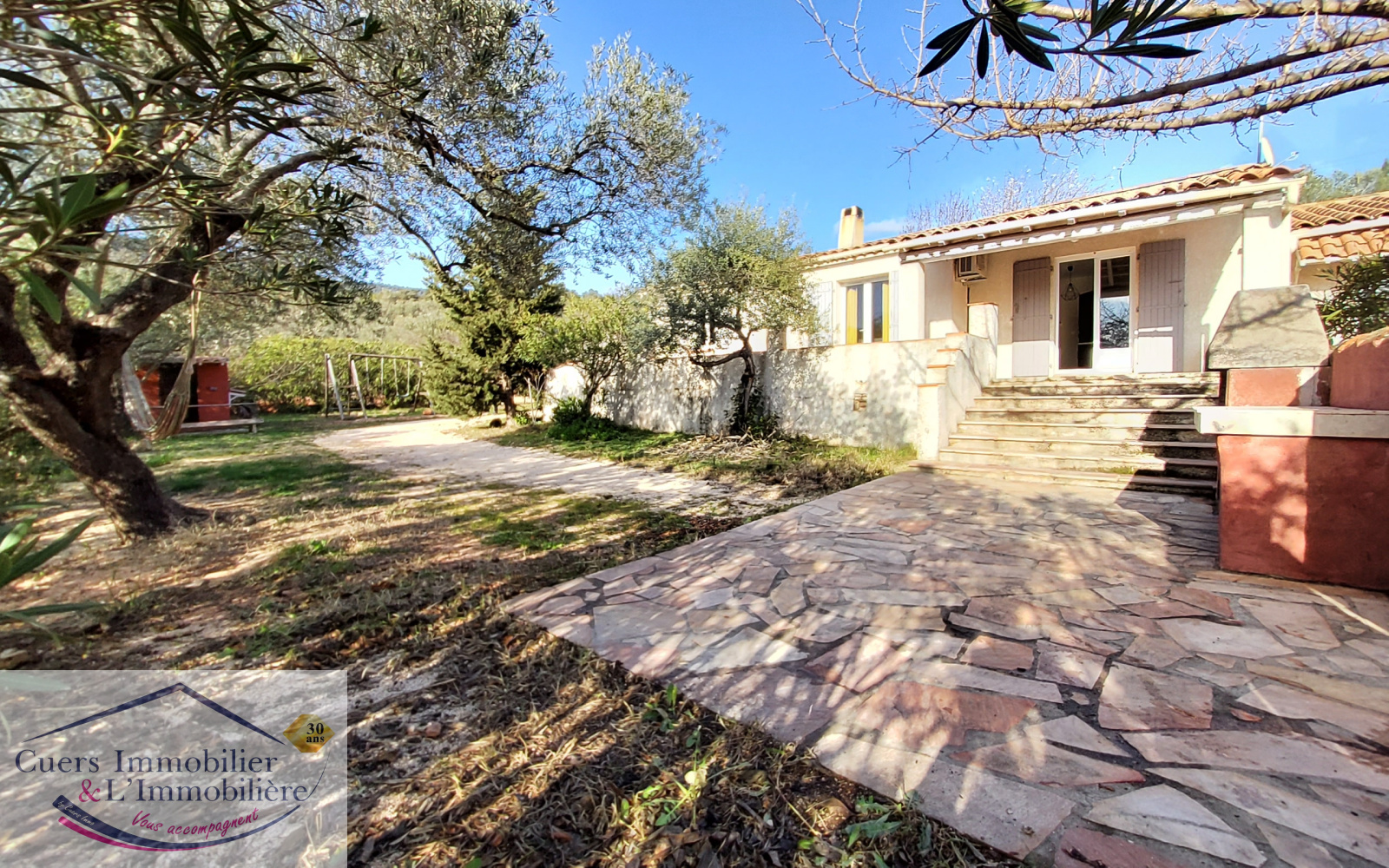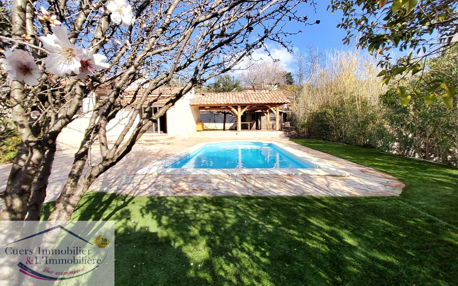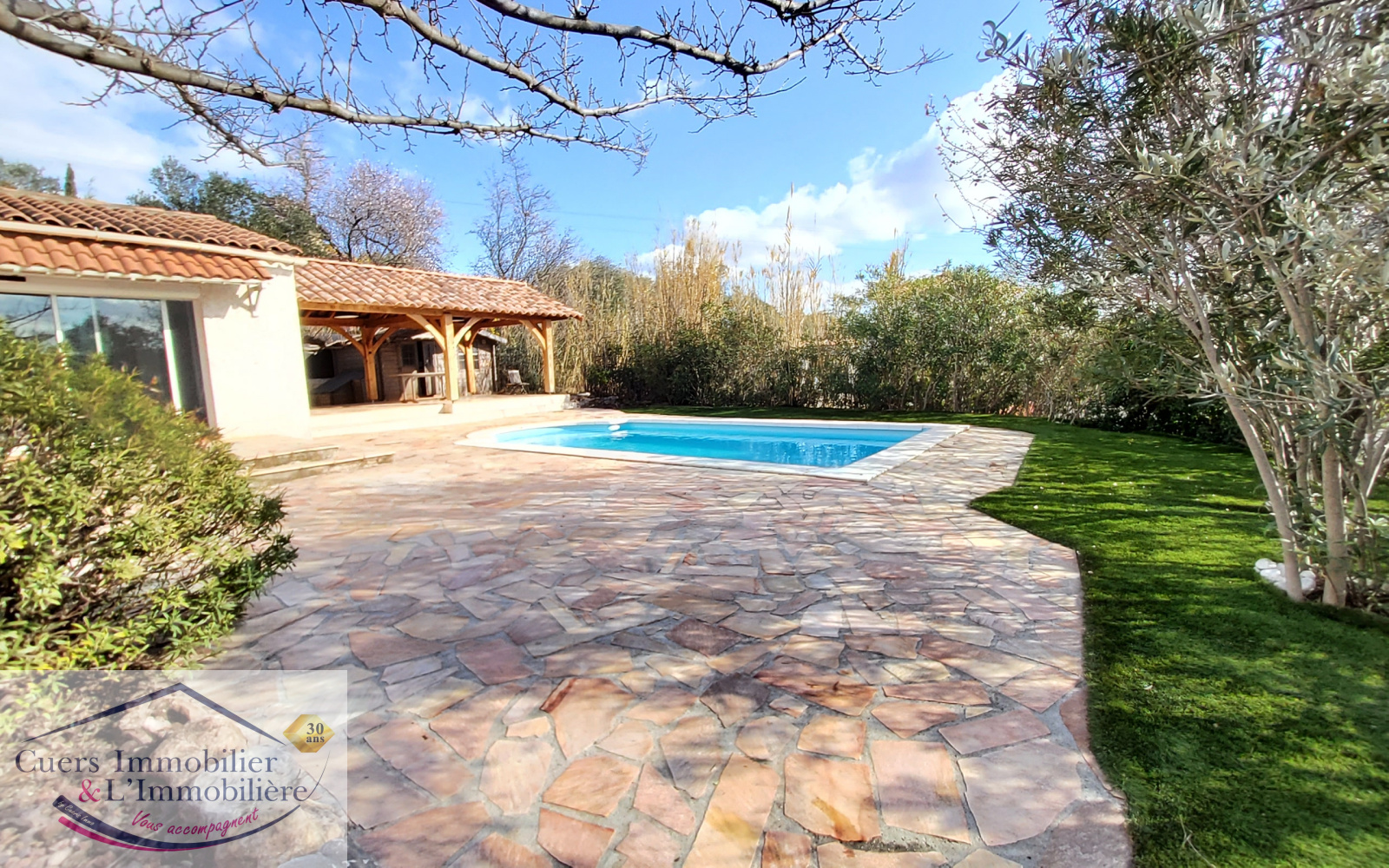Cuers (83390)Cuers, dans un quartier calme et recherché, découvrez cette villa de plain-pied T5, d'environ 110m2 sur un terrain plat et arboré de 982m2.