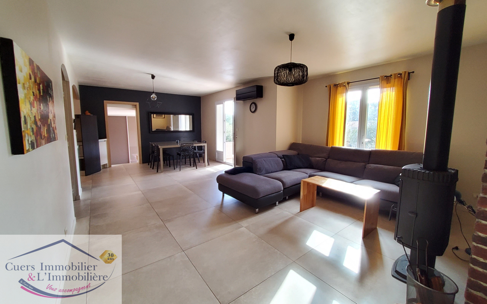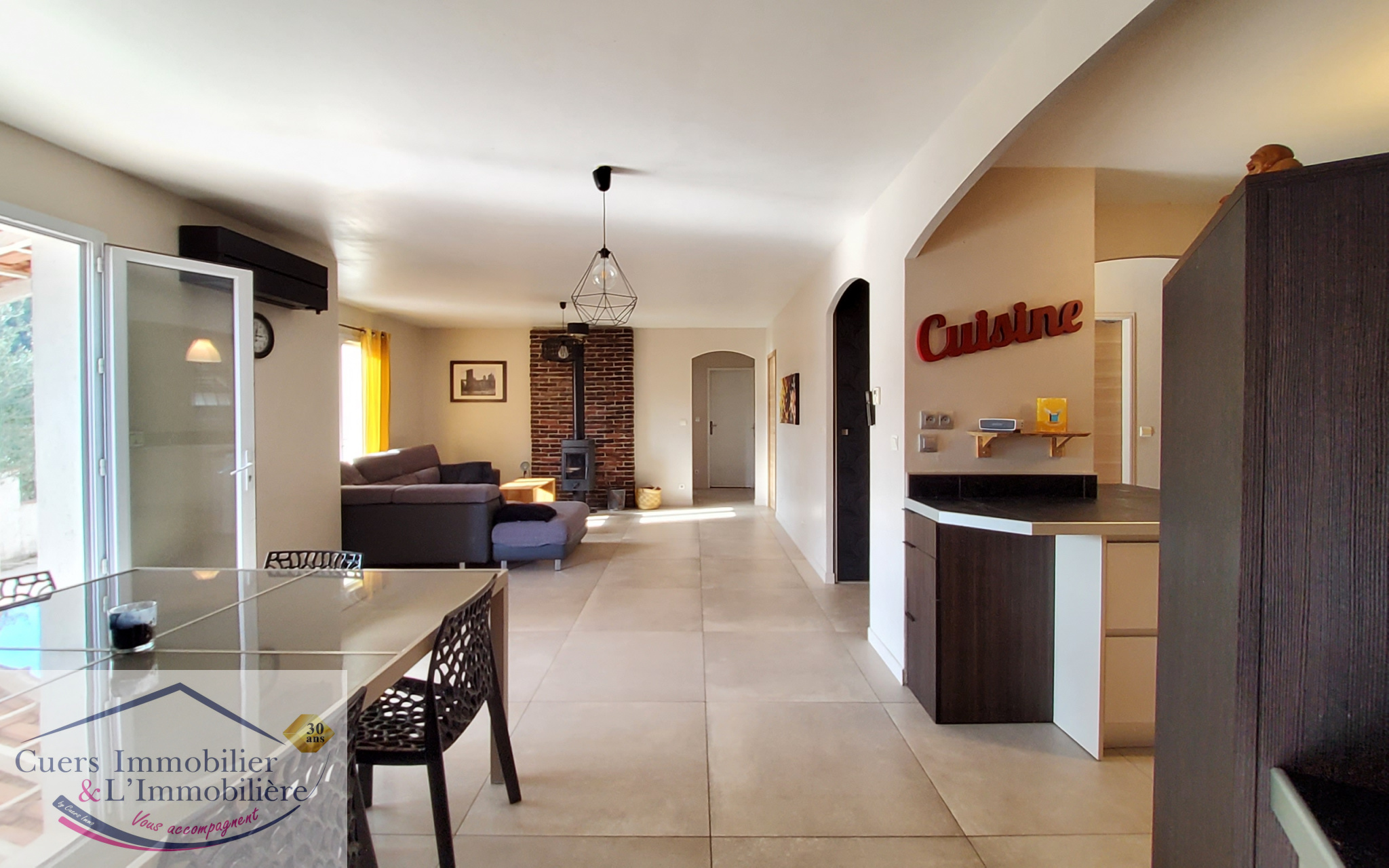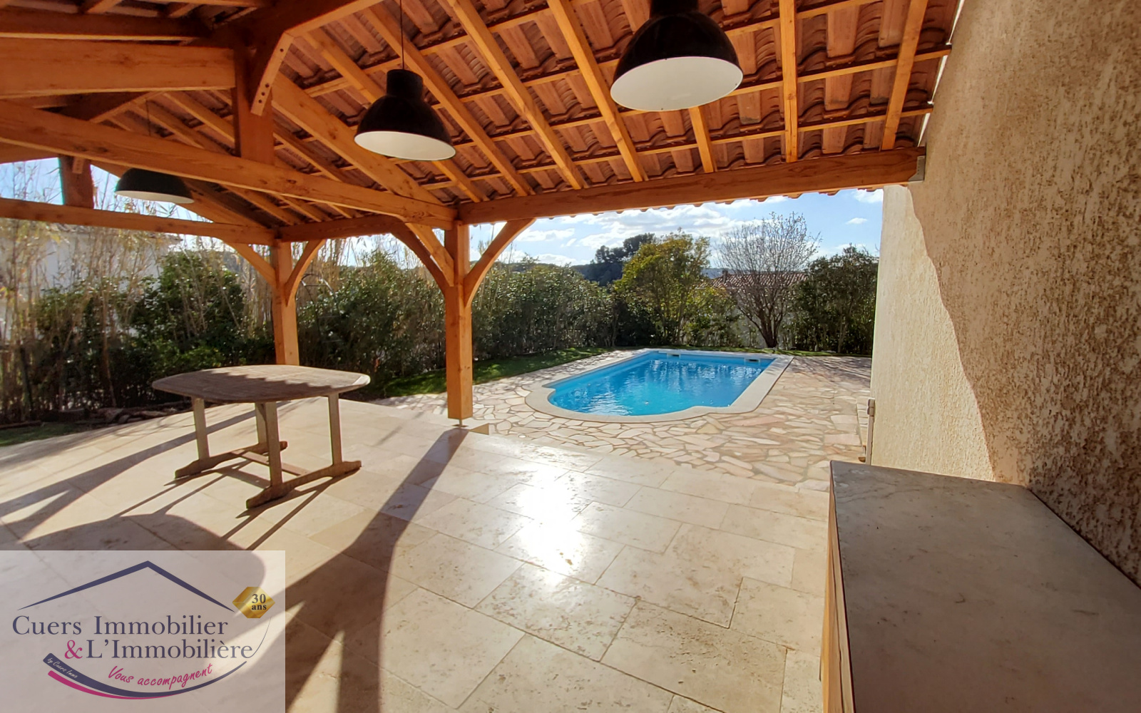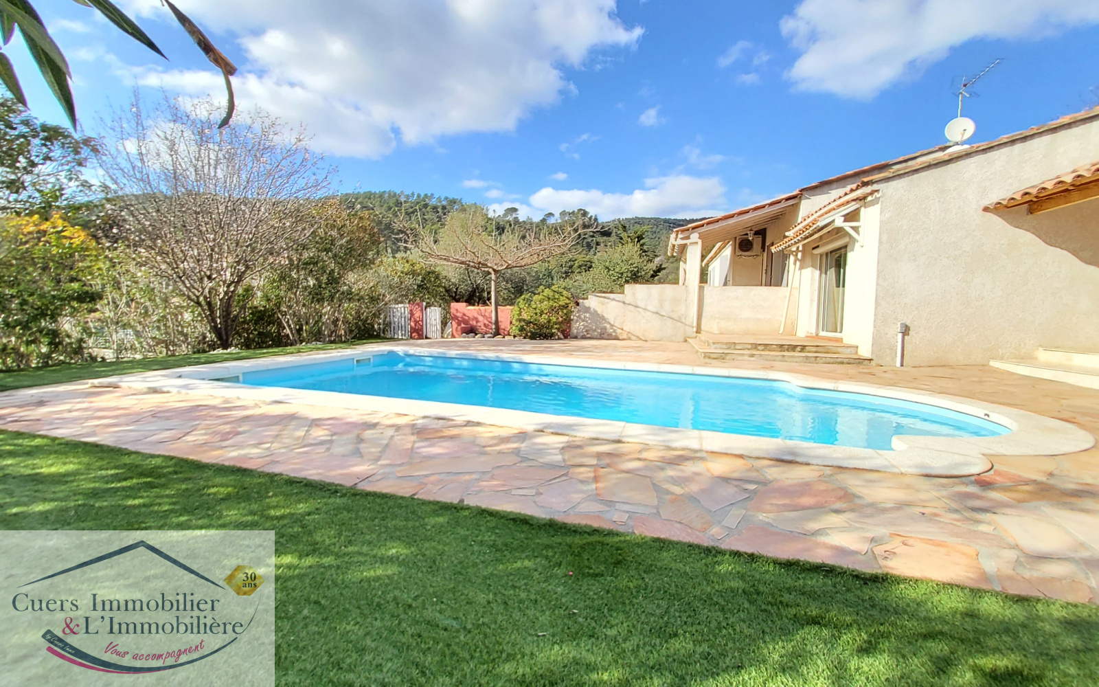 Cuers (83390)Cuers, dans un quartier calme et recherché, découvrez cette villa de plain-pied T5, d'environ 110m2 sur un terrain plat et arboré de 982m2.