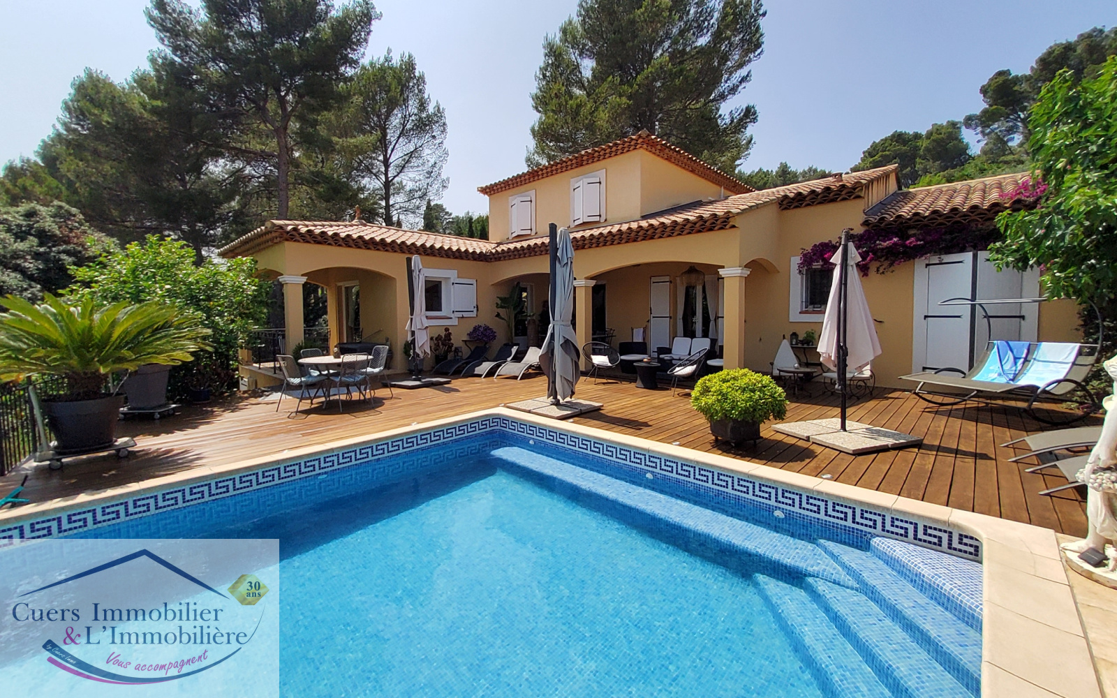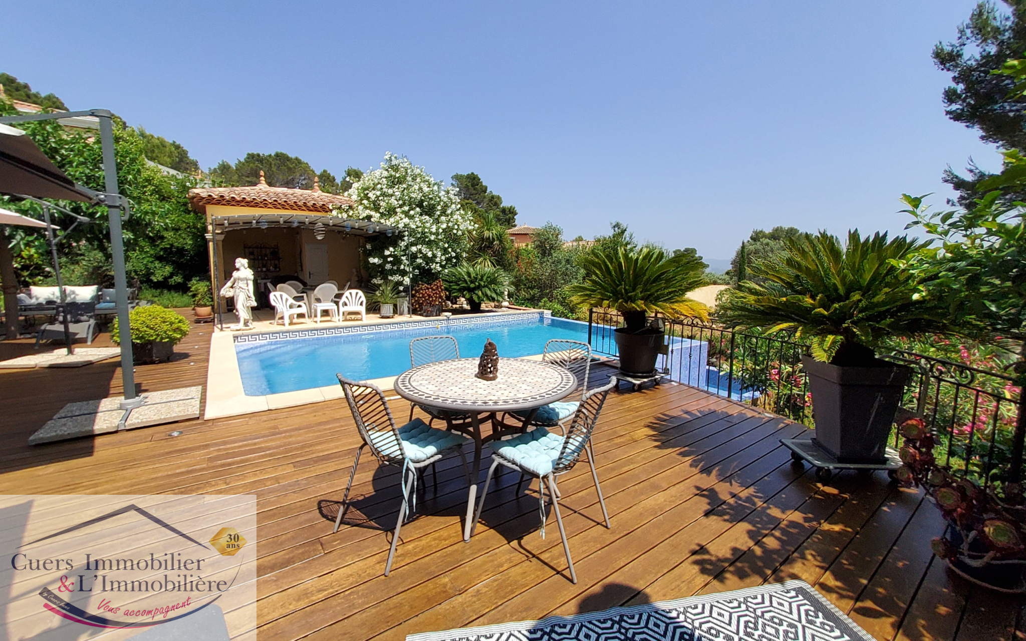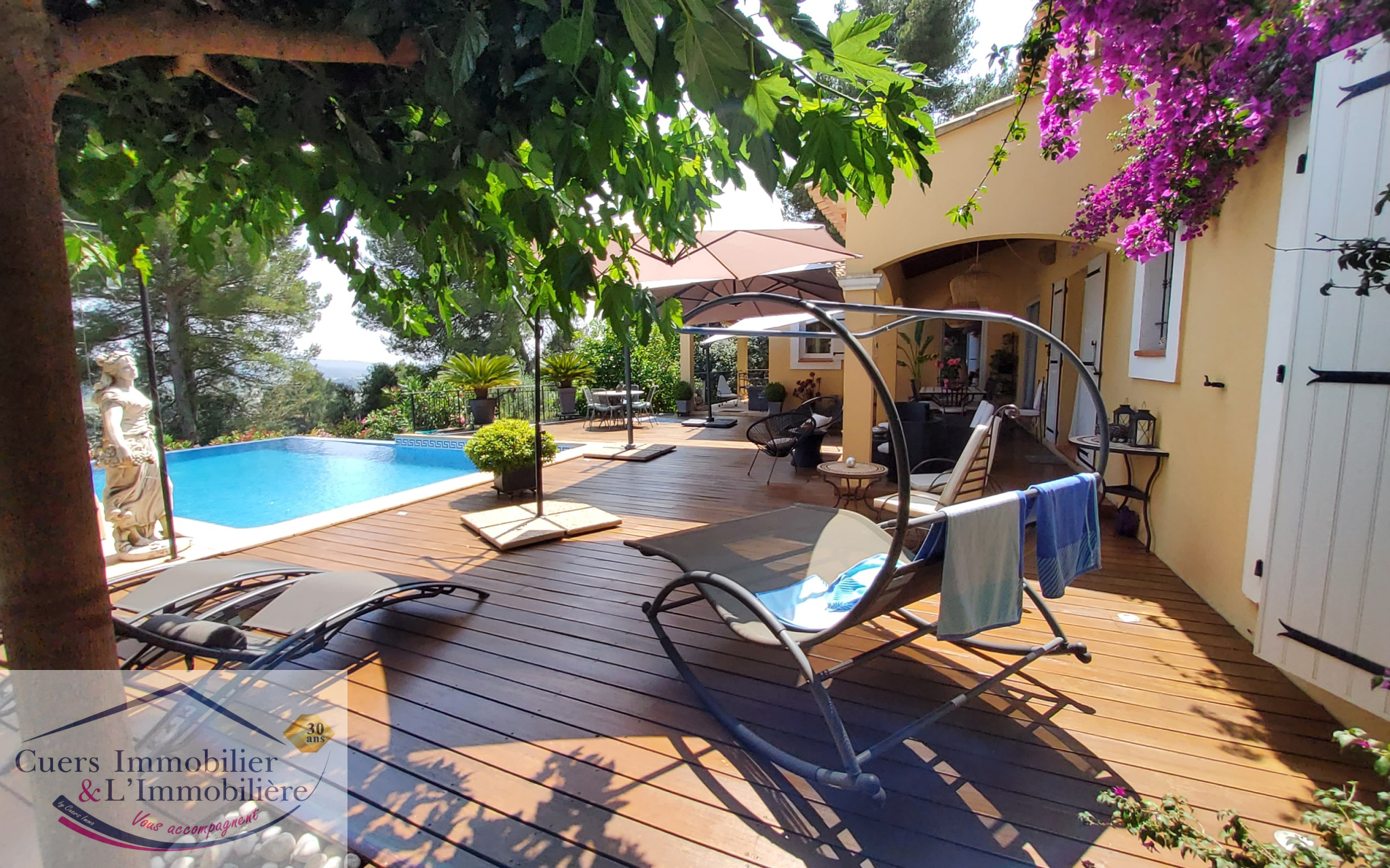 Cuers (83390)Cuers, avec une superbe vue dégagée et au coeur d'un environnement privilégié, découvrez cette villa d'environ 172m2 édifiée sur un terrain de 2000m2, avec dépedances et piscine à débordement.