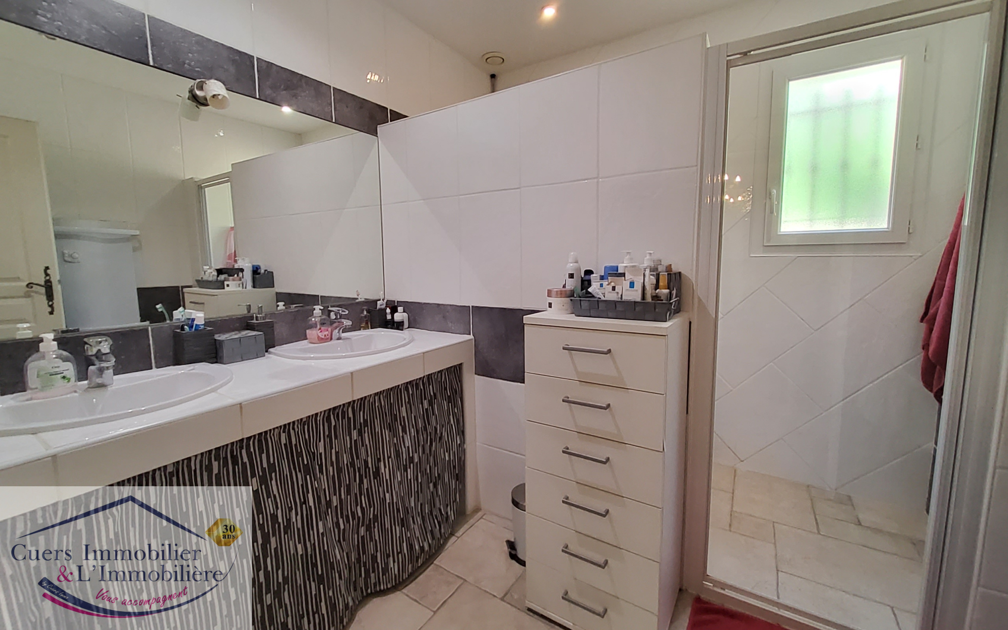 Principalement exposée sud, elle se compose au rez-de-chaussée, d'une entrée avec placard, une cuisine aménagée et équipée ouverte sur un grand salon/salle à manger avec baie à galandage faisant face à la piscine, un second salon, un dégagement desservant un cellier/buanderie,
