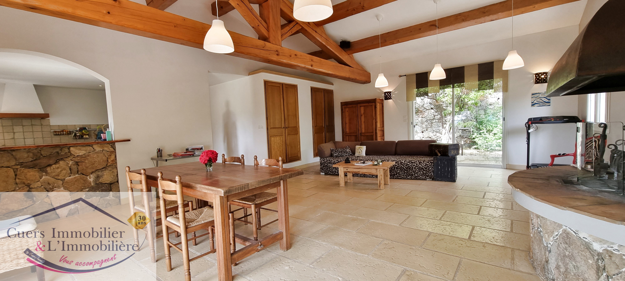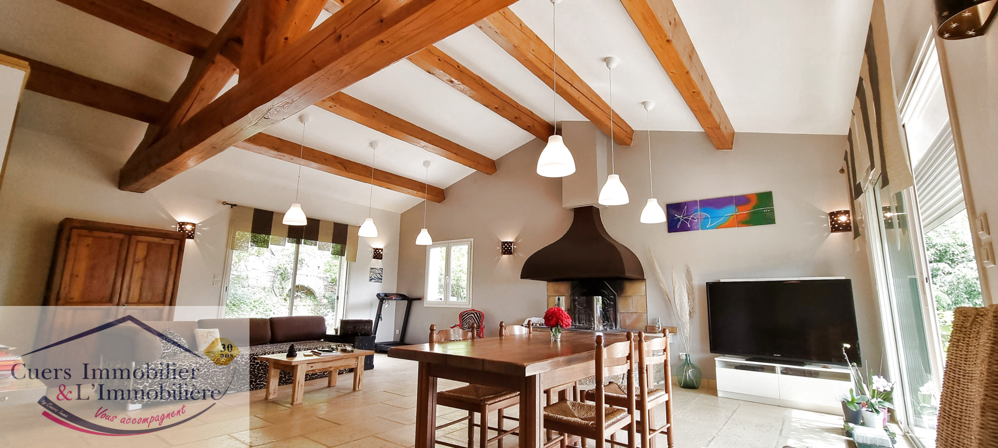 Au 1er niveau, un grand séjour avec cheminée et une cuisine semi-ouverte totalisant environ 61 m², terrasse d'environ 33 m² et sa pergola vegétalisée offrant un charmant panorama. Accès au jardin par une baie coulissante.