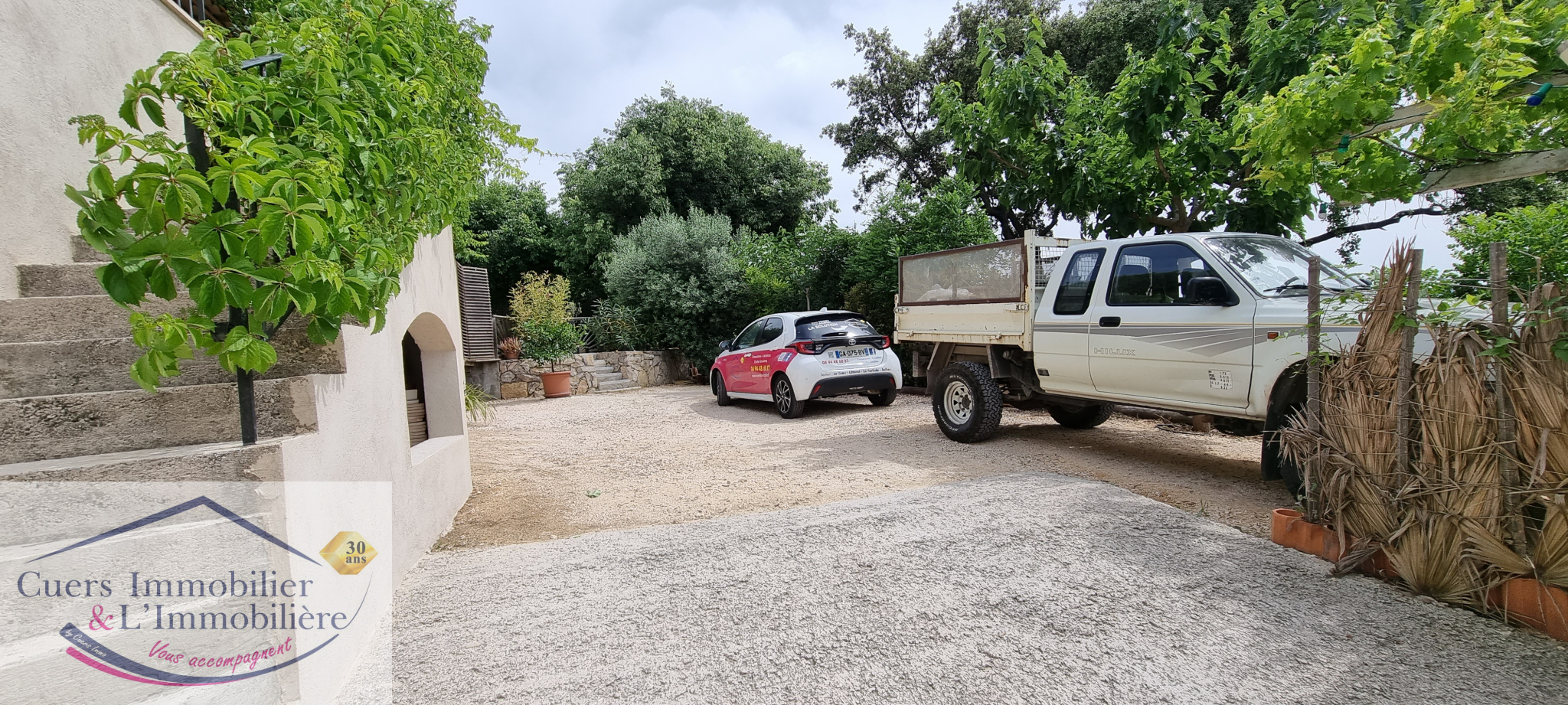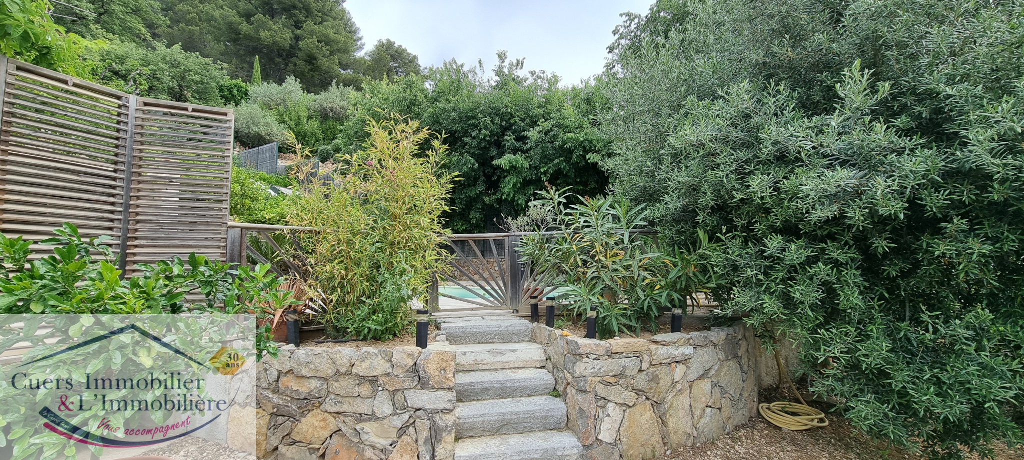 Le jardin est aménagé au gré des restanques avec de beaux murs en pierres sèches, espace pour un potager et un poulailler, abri de jardin, aire de stationnement.