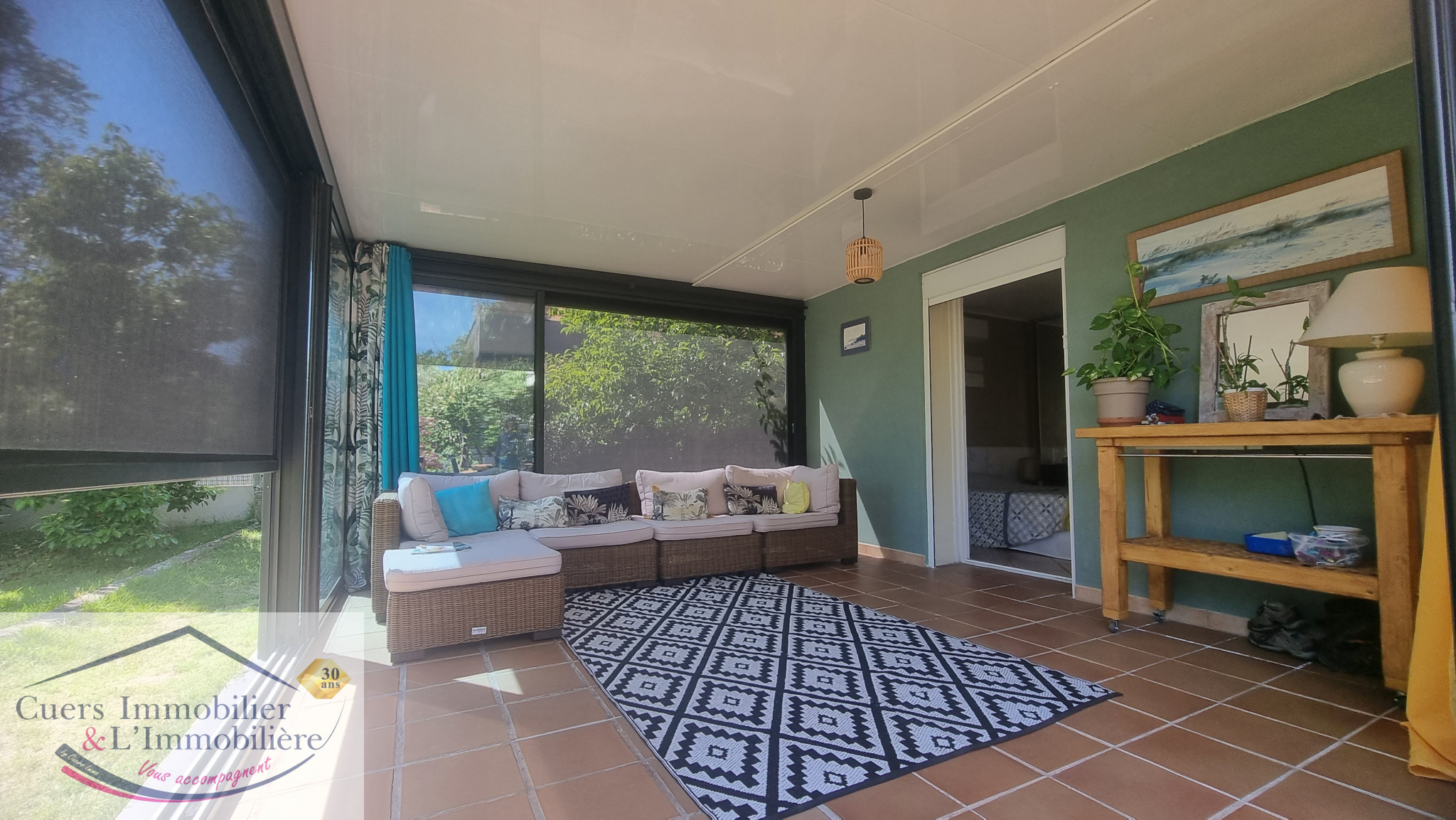 Belle terrasse avec véranda et pergola, balcon au 1er étage, terrasse côté studio, garage et jardin arboré.