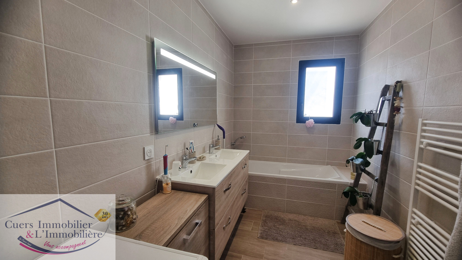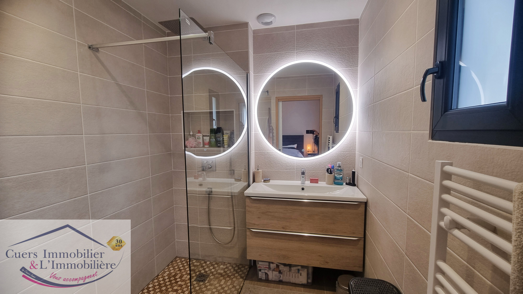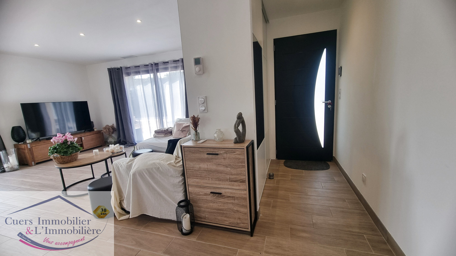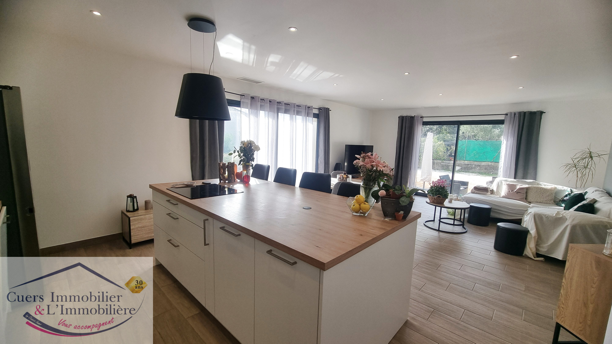 Répondant parfaitement aux tendances actuelles, elle se compose d'un hall d'entrée avec placard, une cuisine contemporaine aménagée et équipée ouverte sur un salon/séjour d'environ 46 m², lumineux.
