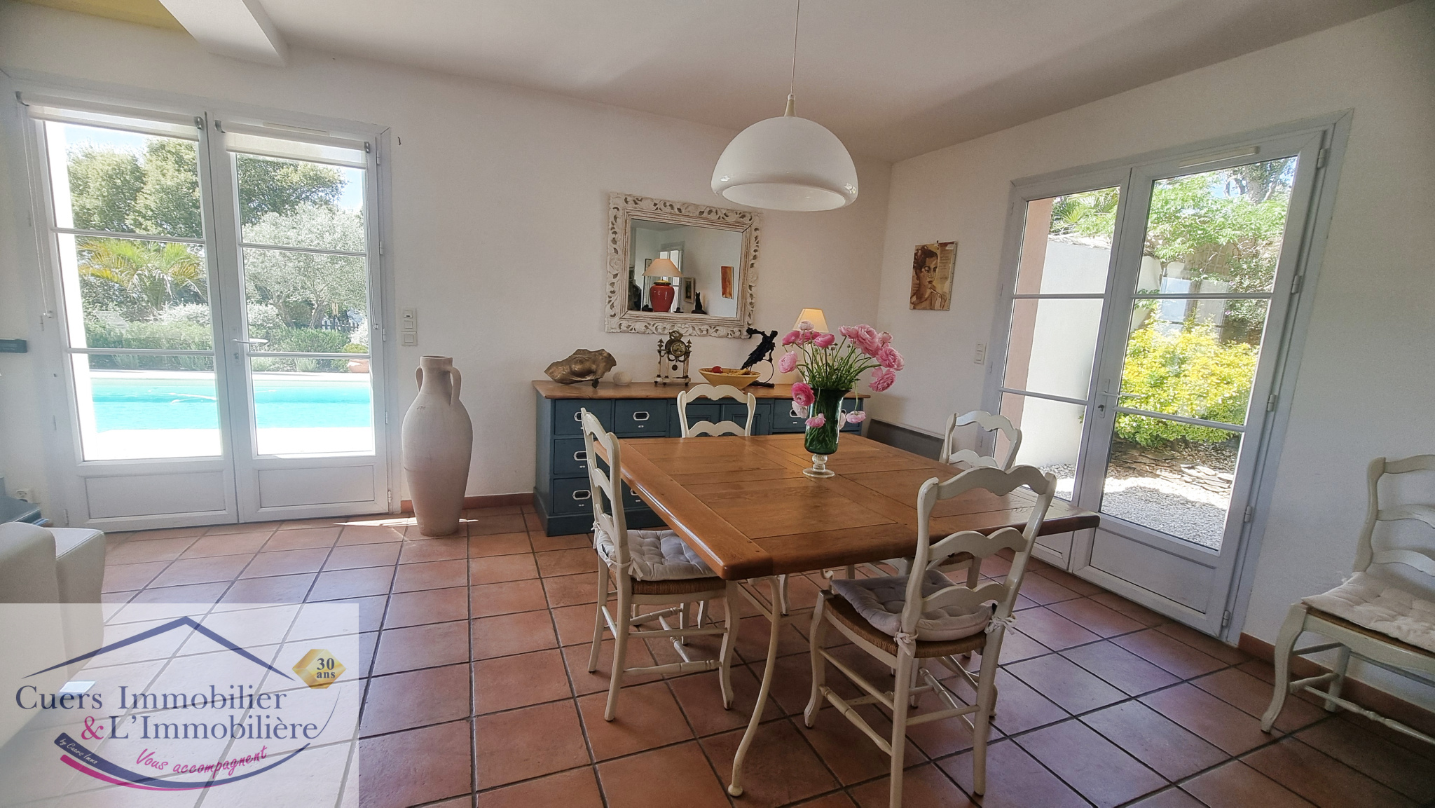 Vous bénéficierez pour cette villa d'environ 125 m² du confort d'une vie quotidienne de plain-pied, avec un vaste espace de vie d'environ 62 m² exposée SUD-OUEST, tourné vers ses terrasses et sa piscine, composé par un salon/séjour équipé d'un poêle à pellets pour le cocooning, une cuisine semi-ouverte, un emplacement idéal pour un bureau ou un coin lecture face au patio. Le pôle nuit principal se compose de 2 chambres d'environ 17 m² et 23 m² chacune avec placard et sde privative, et donnant sur la terrasse.