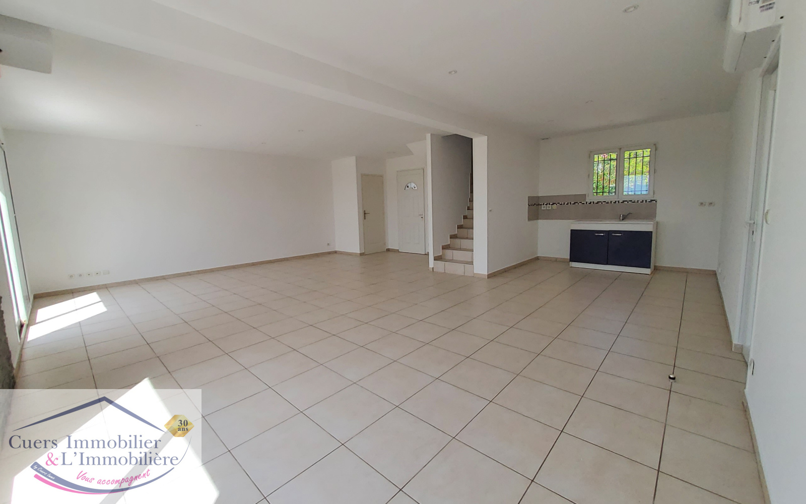 Cette villa comprend au rez-de-chaussée un grande pièce à vivre d'environ 50m2 avec cuisine ouverte sur salon/salle à manger, et un wc.