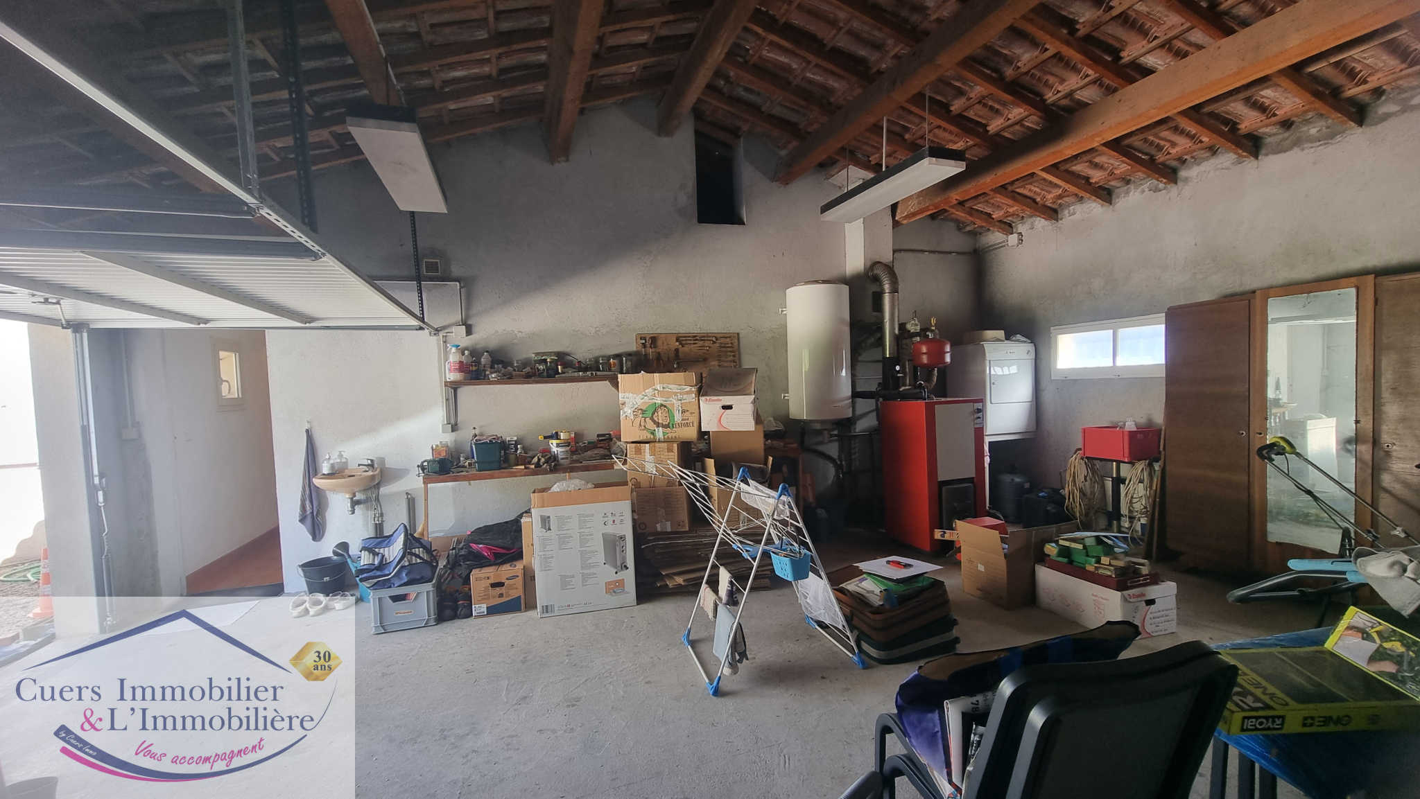 Un double garage d'environ 44m² communiquant avec la maison offrant un bel espace de rangement et la place pour un atelier de bricoalge.