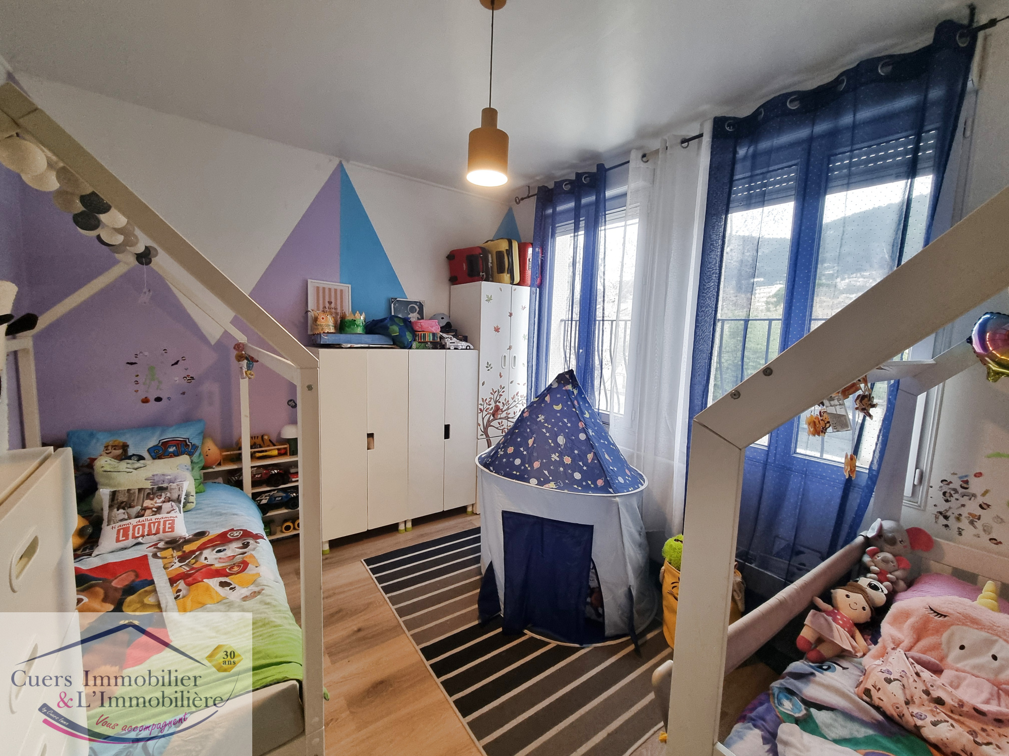 Il comprend une entrée donnant sur une cuisine aménagée et équipée ouverte sur un salon/séjour, totalisant environ 35m². Un dégagement dessert un pôle nuit disposant de trois chambres (environ 12m² chacune), une SDB, un WC avec lave mains.