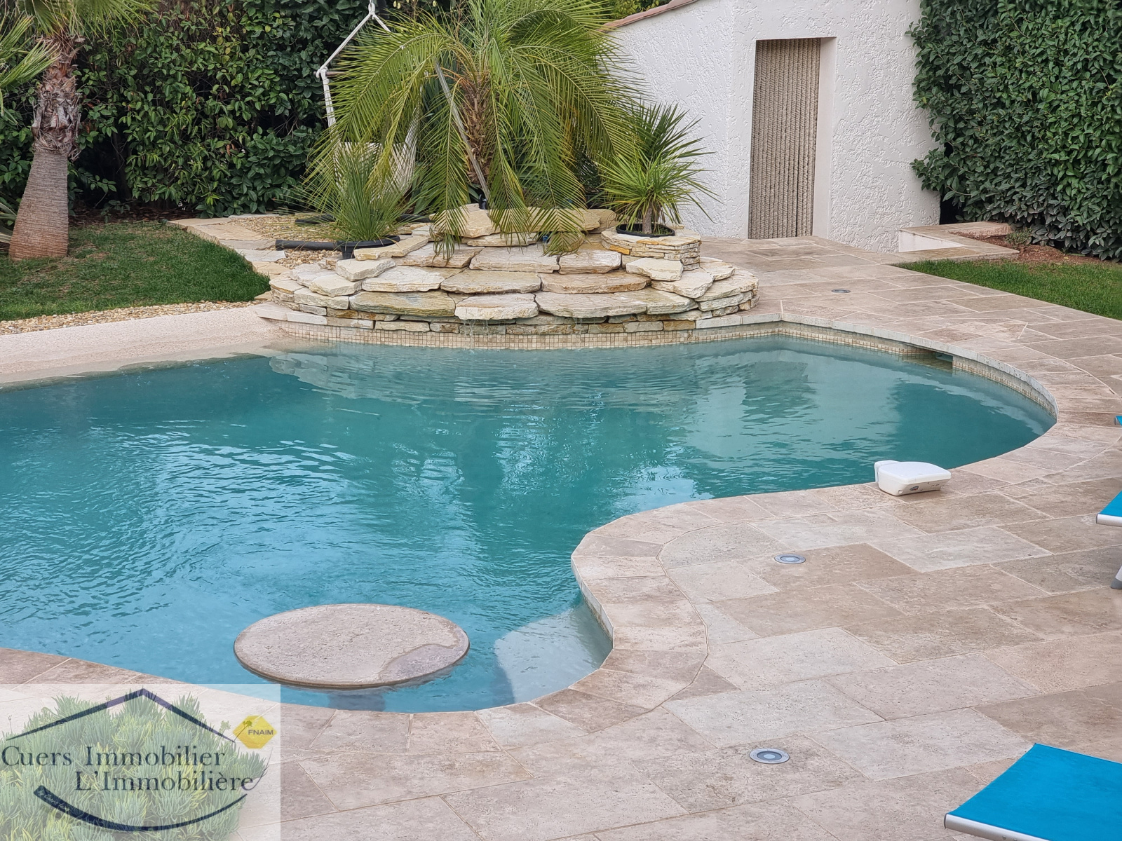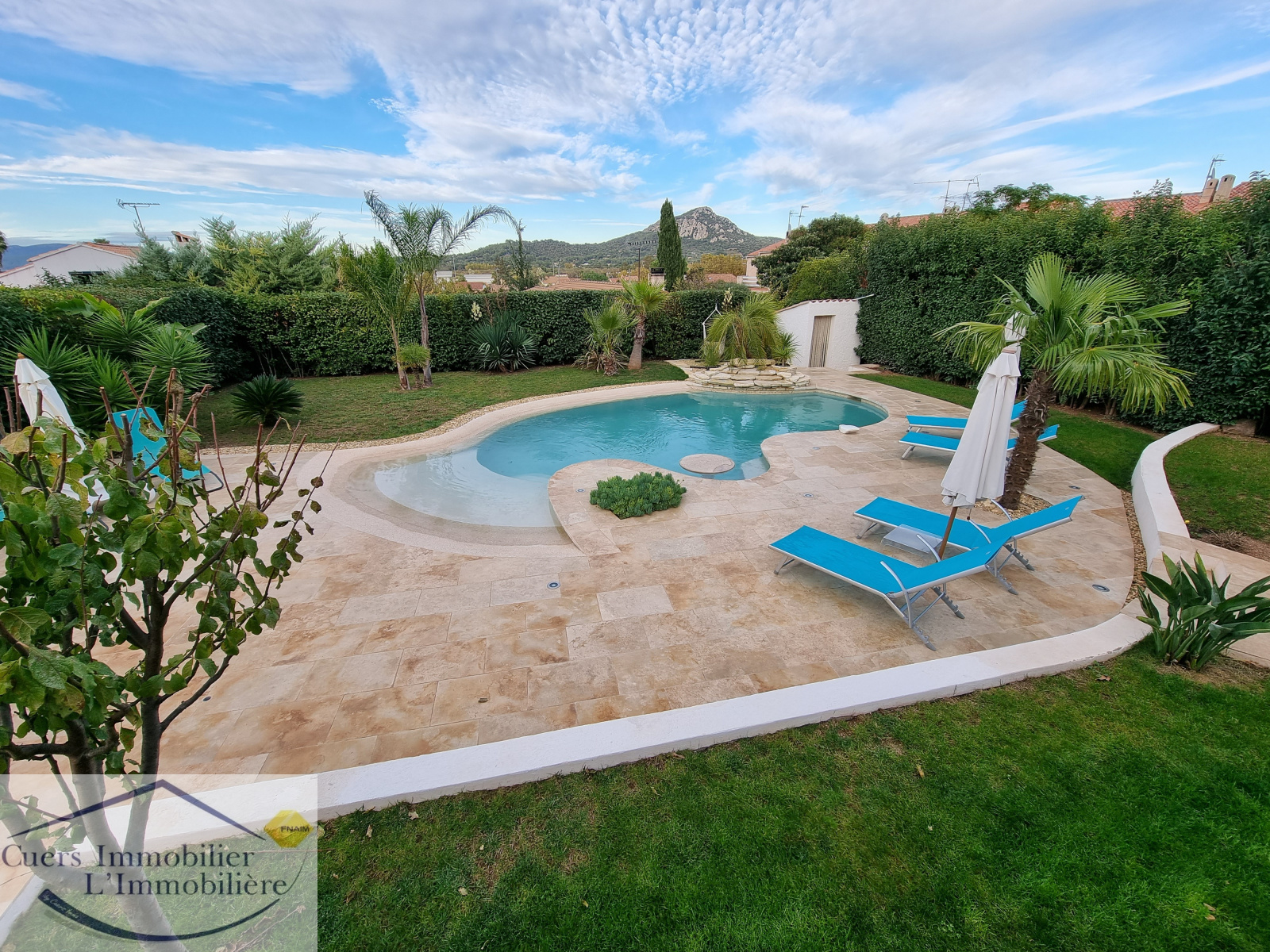 Côté jardin, une magnifique piscine avec large plage intégrée, 100 m² de terrasses en travertin, un joli panorama sur le Fenouillet.