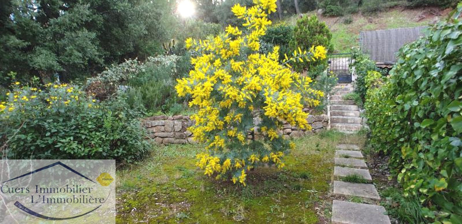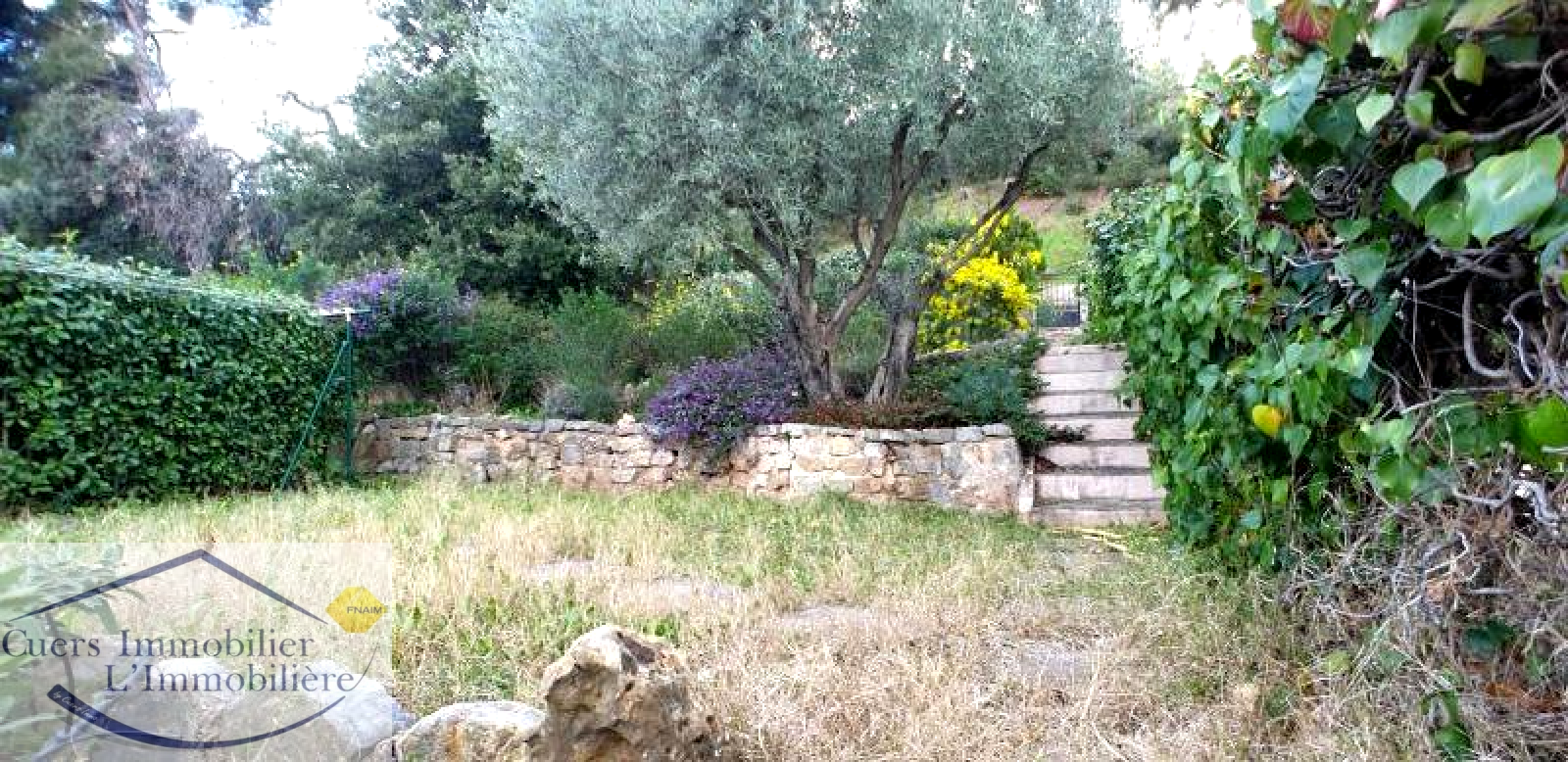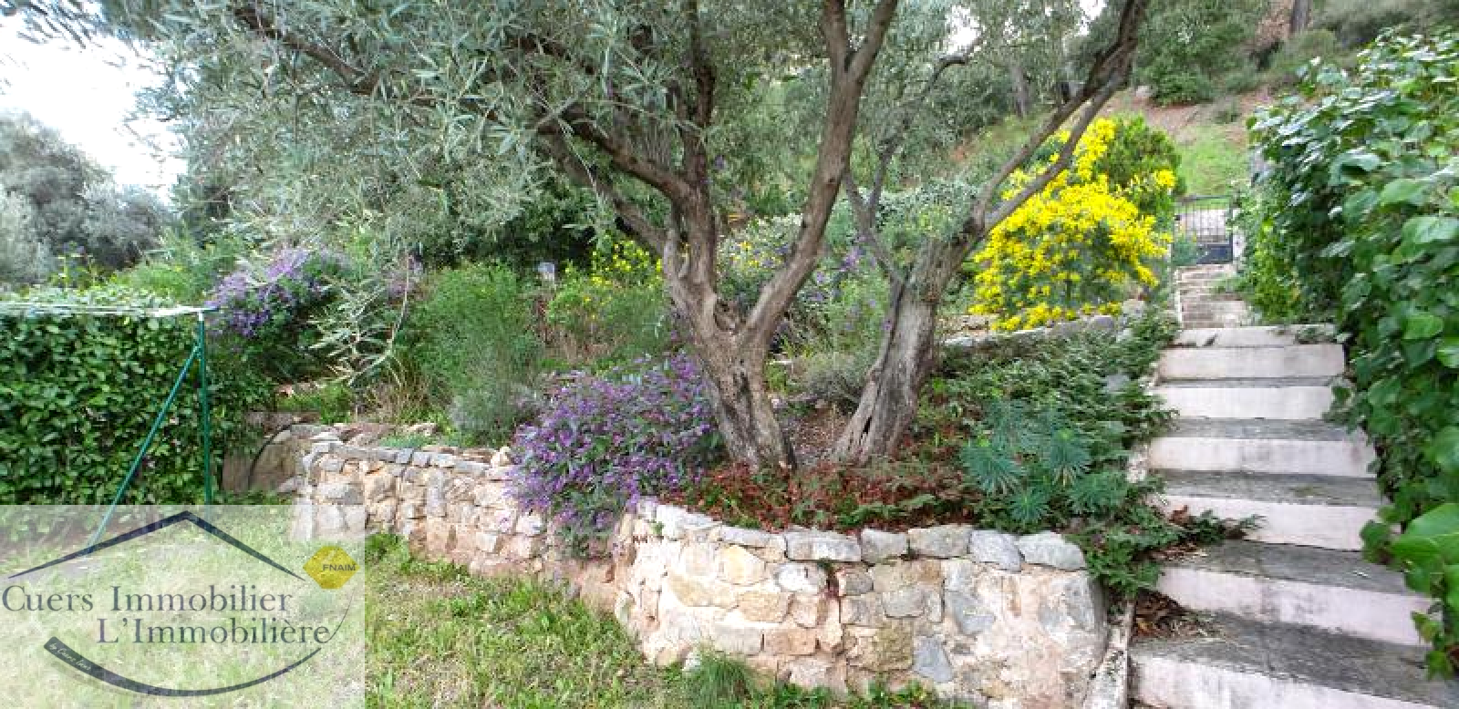 L'accès au jardin se fait depuis cet étage. Il est composé par 2 grandes restanques plantées d'oliviers et essences méditérrannéennes (arrosage automatique). Il vous permettra de profiter sereinement d'un bel espace de vie extérieur, sans vis-à-vis, en bordure d'espaces boisés.
