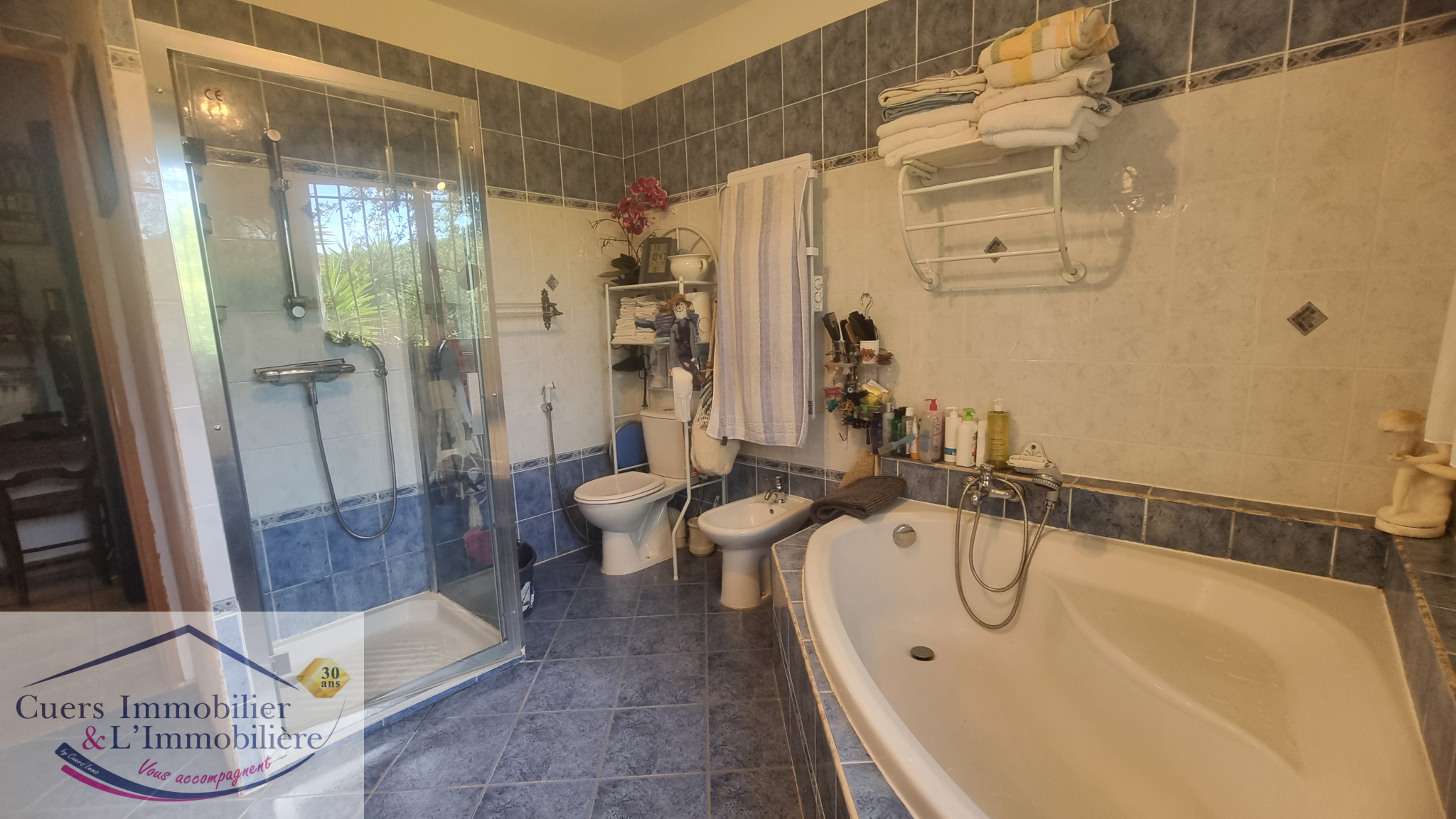 Cette construction édifiée au cours de l'année 2000 se compose d'un hall d’entrée avec placard et wc, un vaste séjour/salon d'environ 65m² lumineux avec une belle hauteur sous plafond de 3m. Attenante, une grande cuisine aménagée et équipée d'environ 18m² prolongée par une véranda d'environ 18m².
